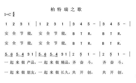 [摘要]? 《柏特瑞之歌》既是柏特瑞的企業(yè)之歌,也是體現(xiàn)行業(yè)使命的一首歌! 注:《柏特瑞之歌》曲調(diào)同《兩只老虎》,旋律簡(jiǎn)單明快。