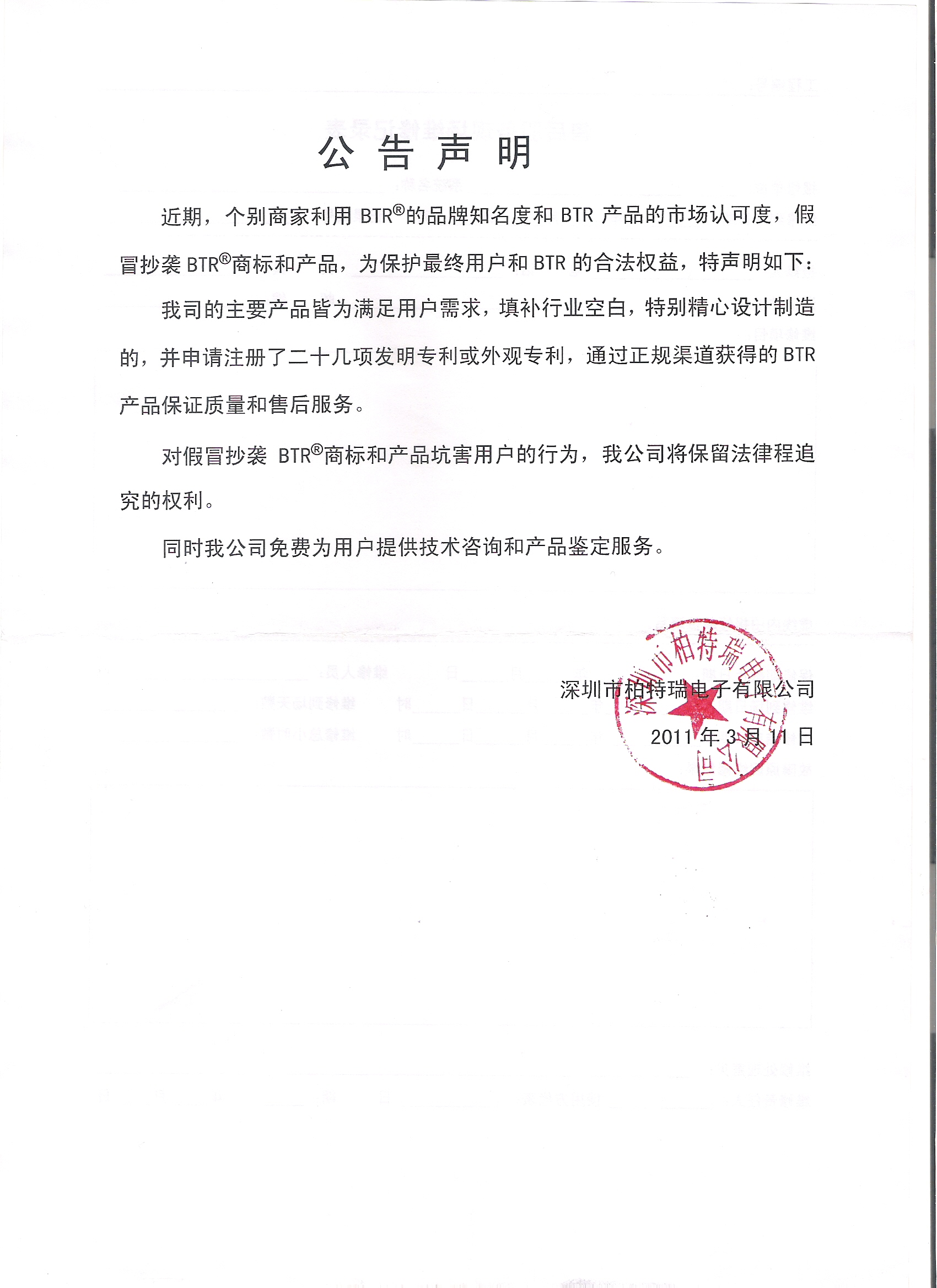 To protect the end users and BTR’s legitimate rights and interests,we make statement as following: